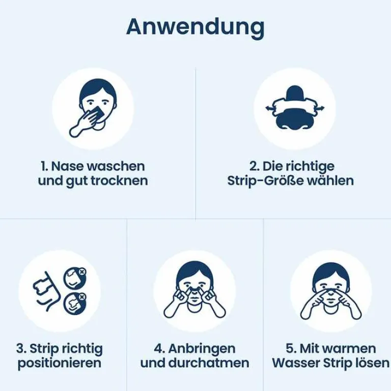 Waschen und trocknen Sie zunächst Ihre Nase, um Schmutz und Öle zu entfernen. (Verwenden Sie bei fettiger Haut ein Adstringens). Entfernen Sie dann die Schutzfolie des Pflasters und bringen Sie das Nasenstrip mittig des Nasenrückens an. Streichen Sie das Nasenstrip glatt, und drücken Sie dann auf die Enden, um das Nasenstrip zu befestigen.