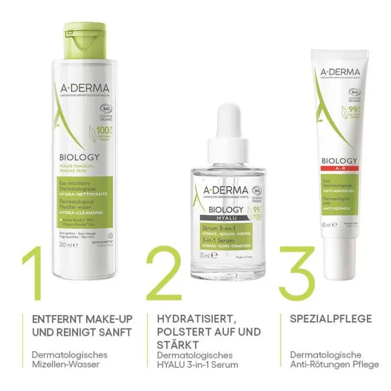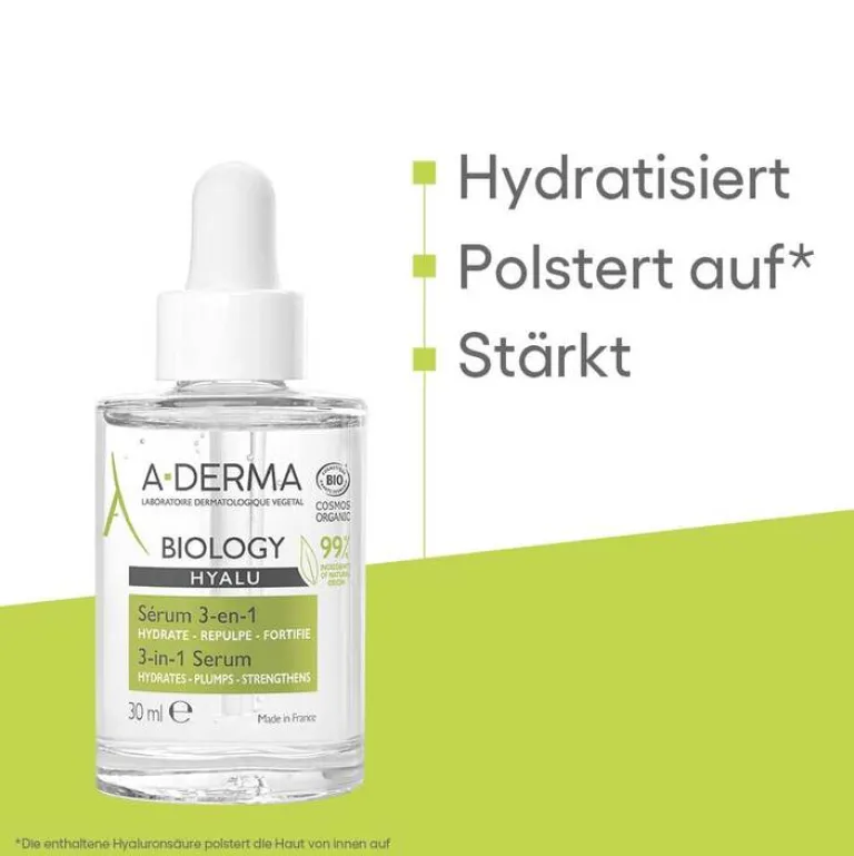 Das A-Derma Biology Hyalu Serum 3 in 1 ist eine duale Hydratation in Epidermis und unterer Epidermis. Es hält die Feuchtigkeit bis zu 72 Std. lang in der Haut.** Das Serum ist mit Anti-Pollution-Effekt und enthält nur 9 Inhaltsstoffe, 99% der Inhaltsstoffe sind natürlichen Ursrungs. Es kommt ohne Duftstoffe aus und wurde an allergischer Haut unter dermatologischer und ophthalmologischer Kontrolle getestet.