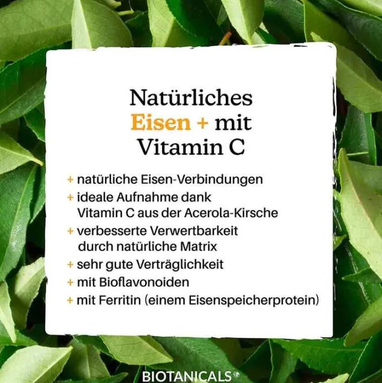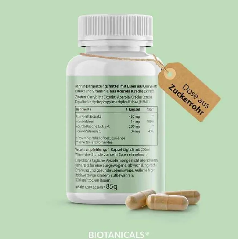 Das Eisen von Biotanicals ist ein aus dem Curryblatt extrahiertes organisches Eisen. Außer Eisen enthält das Curryblatt viele wichtige Bioflavonoide und weitere Mikronährstoffe, welche die Aufnahme von Eisen begünstigen. Zusätzlich enthält unser Eisen ein Extrakt der Acerola Kirsche, um die Bioverfügbarkeit des Eisenpräparates noch mal zu optimieren.