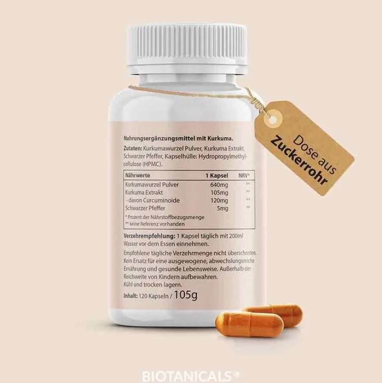 Die Kurkuma-Kapsel von Biotanicals ist ein Produkt, welches drei Bestandteile enthält: