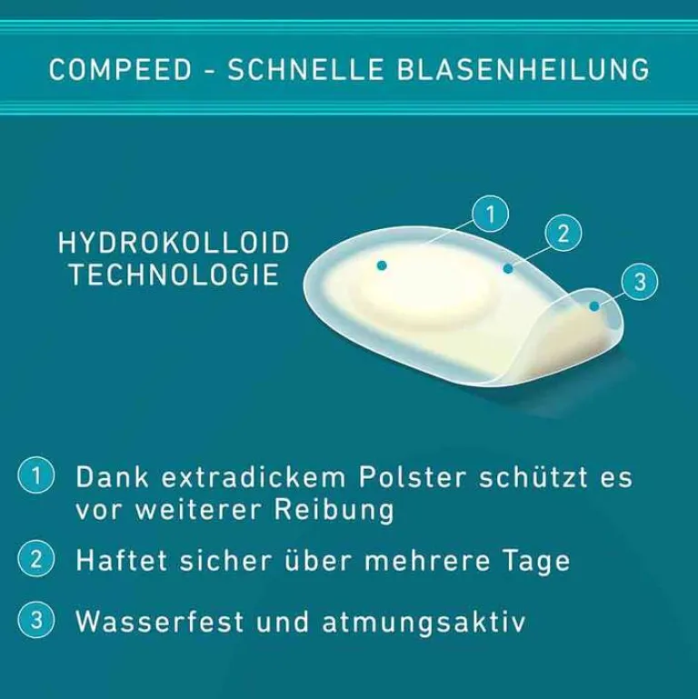 Compeed Blasenpflaster werden direkt auf die Blase geklebt. Dort wirken sie wie eine zweite Haut, lindern Druck und Schmerzen sofort und schützen die Wunde vor Wasser, Schmutz und Bakterien. Das Compeed Blasenpflaster kann in jedem Stadium der Blasenbildung und -heilung eingesetzt werden, doch generell gilt: Je früher es angewendet wird, desto schneller heilt die Blase ab.