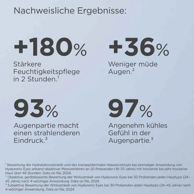 * Bewertung der Hydratationskinetik und des transepidermalen Wasserverlusts bei einmaliger Anwendung von Hyaluronic Eyes anhand objektiver Messverfahren an 20 Probanden (18–70 Jahre) mit trockener bis sehr trockener Haut über 48 Stunden. Data on file, 2024.