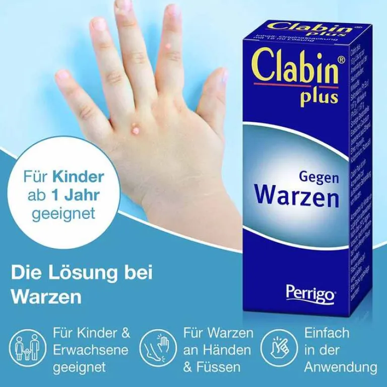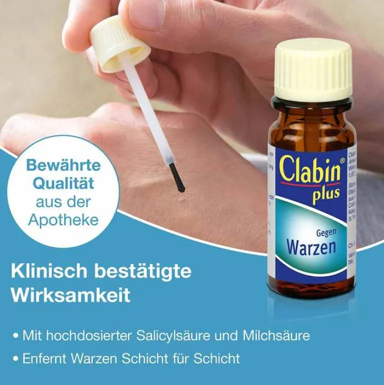 Clabin plus Lösung, Lösung, 15 mlClabin® Plus, 10 g Lösung enthält: Wirkst.: Milchsäure (Ph.Eur.) 1,67 g; Salicylsäure (Ph.Eur.) 1,67 g; Sonst. Bestandt.: Elastisches Collodium (bestehend aus: Ethanol, Ether, Pyroxylin, Kolophonium, Rizinusöl). Anw.: Zur äußerlichen Behandlung von Warzen. Gegenanz.: Überempfindlichkeit gg. Salicylsäure, Milchsäure, Salicylate oder sonst. Bestandt.; nicht bei Säuglingen oder Patienten mit Niereninsuffizienz, bei stillenden Müttern (bei regelm. Behandlung großer Hautflächen); Nebenw.: gelegentlich leichtes, bei häufigerem Auftragen auch stärkeres Brennen bes. auf der die Warze umgeb. Haut; sehr selten: allergische Kontaktdermatitis, Teleangiektasien, braune Flecken, Photosensibilisierung, Dermatitis, Verdünnung der oberen Hautschichten, Pigmentierung, Depigmentierung. Perrigo Deutschland GmbH, Königstraße 26, DE-70173 Stuttgart Stand: Juni 2023