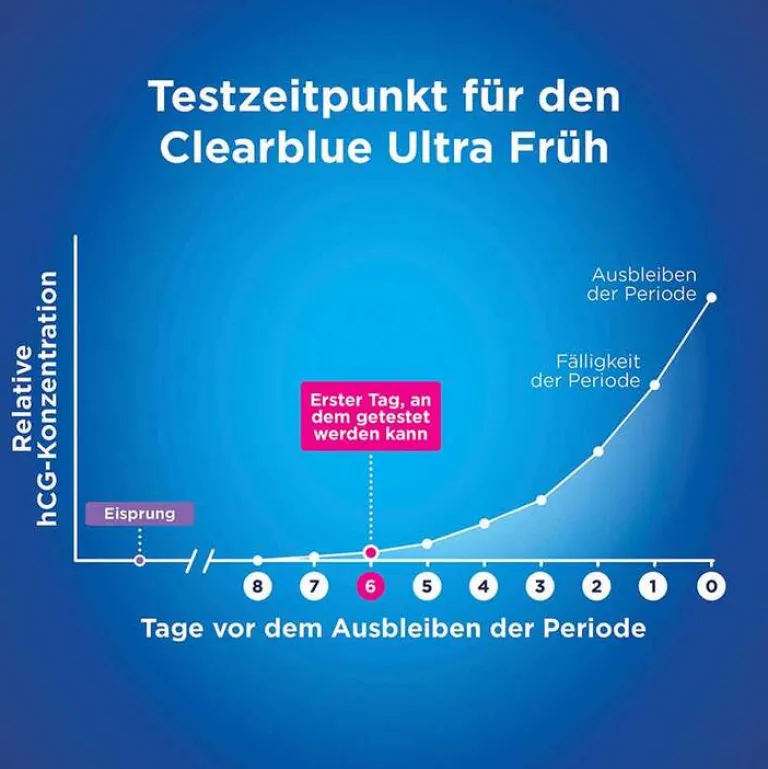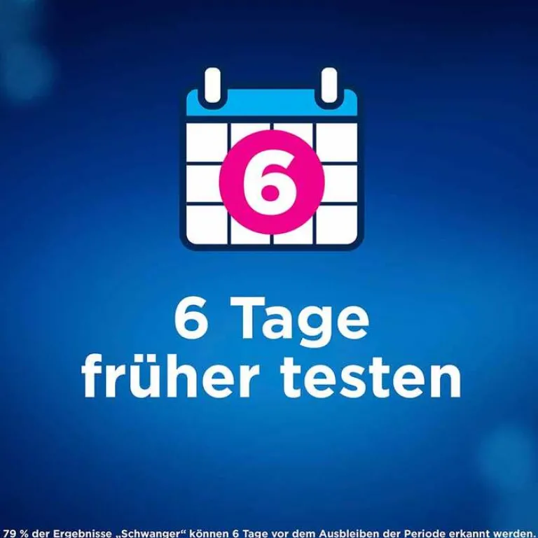 Bei dem Clearblue Schwangerschaftstest Frühe Erkennung handelt es sich um einen Test, mit dem bereits 6 Tage vor dem Ausbleiben der Periode eine Schwangerschaft nachgewiesen werden kann (d. h. 5 Tage vor Fälligkeit der Periode). - Über 99 % Zuverlässigkeit