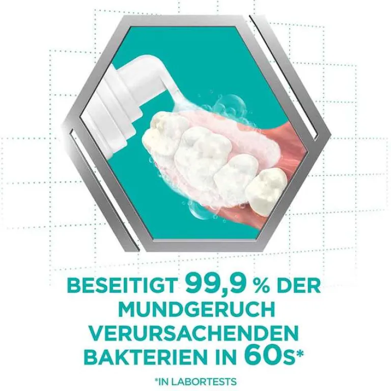 Das Abbürsten mit dem speziellen, nicht abrasiven Reiniger, hilft Verfärbungen zu entfernen und mehr als 99,9 % der Mundgeruch verursachenden Bakterien zu beseitigen* und bietet somit eine hochentwickelte und schnelle Reinigung.** Gleichzeitig sorgt eine Kombination aus Minzölen für zusätzliche Frische.