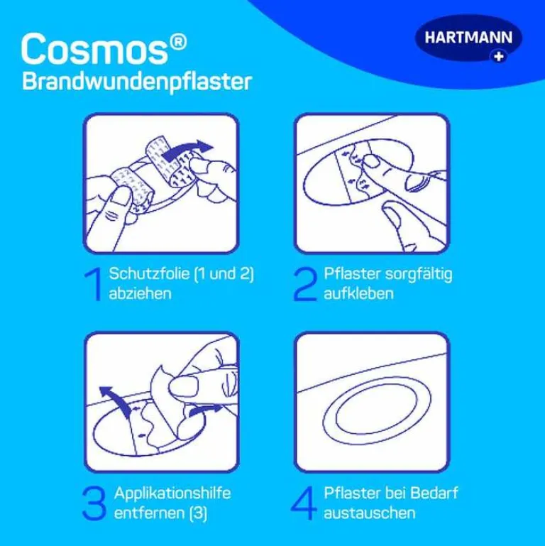 cosmos® Brandwundenpflaster fördern die Wundheilung bei Brandwunden. Das Hydrogel-Wundkissen sorgt für ein ausgewogen feuchtes Wundmilieu und fördert dadurch die Wundheilung. Zudem schützt das Brandwundenpflaster vor Reibung und Druck. Dank seines kühlenden Effektes auf der Haut hat cosmos® Brandwundenpflaster schmerzlindernde Eigenschaften.