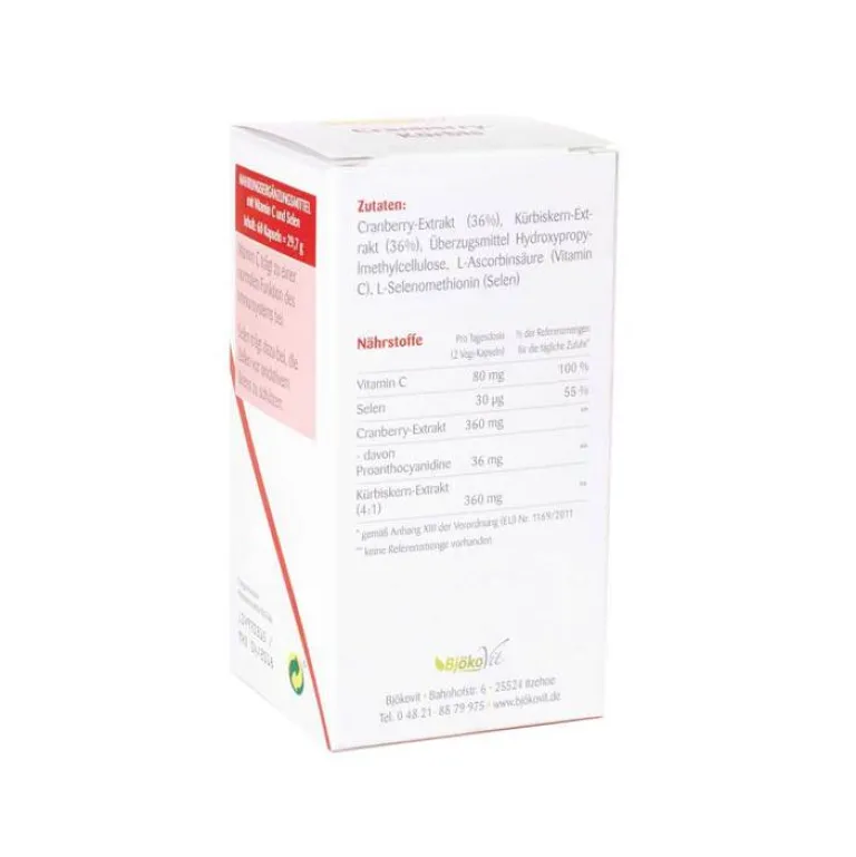 Cranberry-Extrakt (36 %), Kürbiskern-Extrakt (36 %), Überzugsmittel Hydroxylpropylmethycellulose (HPMC) , L-Ascorbinsäure (Vitamin C), L-Selenomethionin (Selen)