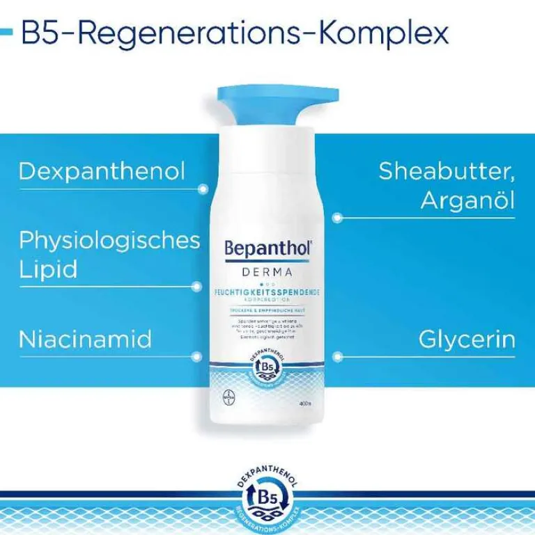 Die Bepanthol Derma feuchtigkeitsspendende Körperlotion ist klinisch geprüft. Die Lotion ist auch zur Pflege bei Diabetes bestens geeignet. 90 % der Inhaltsstoffe sind natürlichen Ursprungs.
