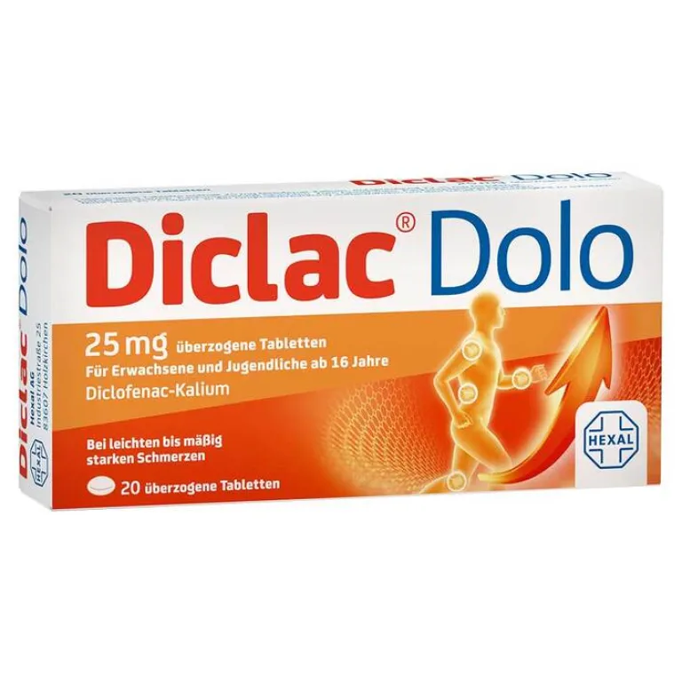 Diclac® Dolo 25 mg, überzogene Tabletten. Wirkstoff: Diclofenac-Kalium. Anwendungsgebiete: Symptomatische Behandlung von leichten bis mäßig starken Schmerzen. Warnhinweise: Bei Schmerzen oder Fieber ohne ärztlichen Rat nicht länger anwenden als in der Packungsbeilage vorgegeben! Enthält Saccharose. Zu Risiken und Nebenwirkungen lesen Sie die Packungsbeilage und fragen Sie Ihre Ärztin, Ihren Arzt oder in Ihrer Apotheke. ! Mat.-Nr.: 2/51015446 Stand: September 2022 Hexal AG, 83607 Holzkirchen, www.hexal.de
