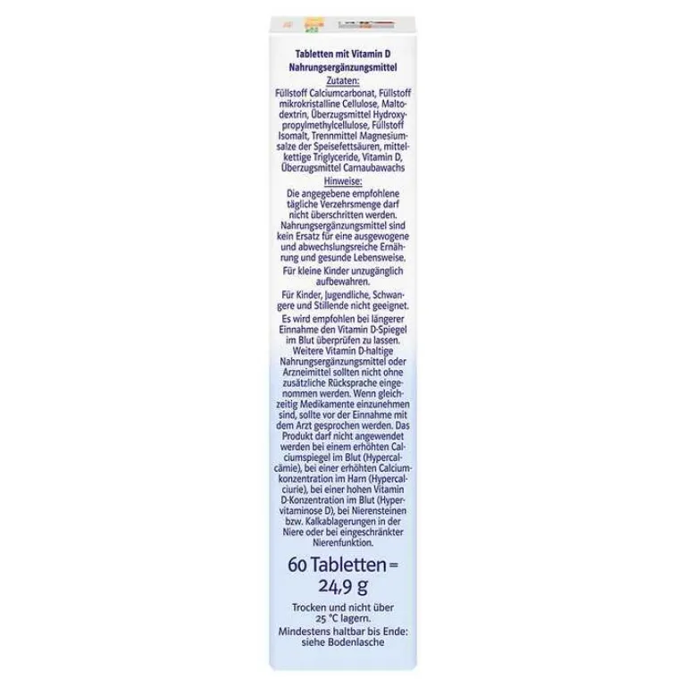 Es wird empfohlen bei längerer Einnahme den Vitamin D-Spiegel im Blut überprüfen zu lassen. Weitere Vitamin D-haltige Nahrungsergänzungsmittel der Arzneimittel sollten nicht ohne zusätzlicheRücksprache eingenommen werden. Wenn gleichzeitig Medikamente einzunehmen sind, sollte vor der Einnahme mit dem Arzt gesprochen werden. Das Produkt darf nicht angewendet werden bei einem erhöhten Cacliumspiegel im Blut (Hypercalcämie), bei einer erhöhten Cacliumkonzentration im Harn (Hypercalciurie), bei einer hohen Vitamin D-Konzentration im Blut (Hypervitaminose D), bei Nierenseinen bzw. Kalkablagerungen in der Niere oder bei eingeschränkter Nierenfunktion.
