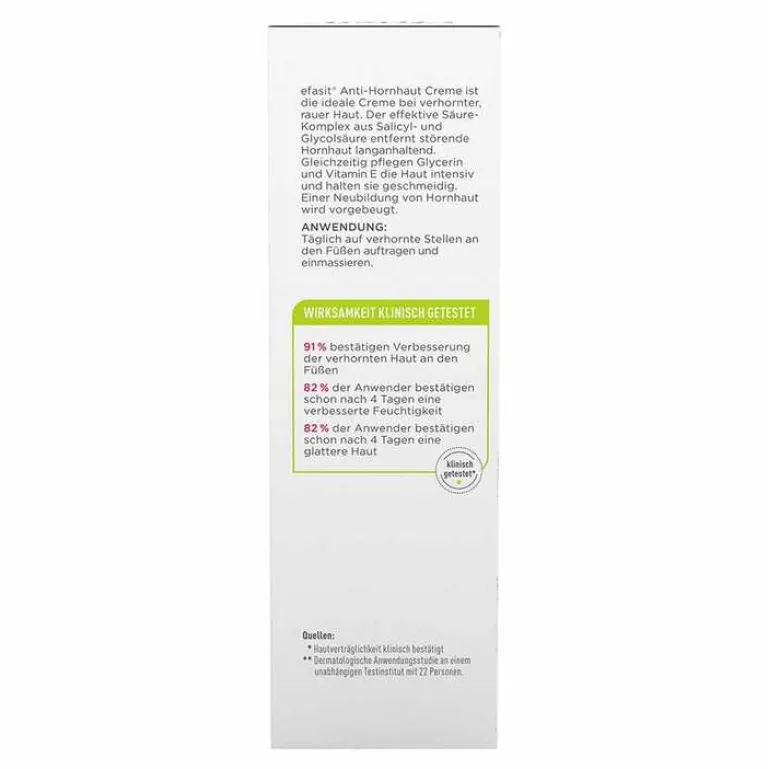 Die Efasit Anti-Hornhaut Creme ist die ideale Pflege bei verhornter, rauer Haut an den Füßen. Der Wirk-Komplex aus Salicylsäure und Glycolsäure entfernt störende Hornhaut effektiv und langanhaltend. Gleichzeitig pflegen Glycerin und Vitamin E die Haut intensiv und halten sie geschmeidig. Die Füße werden wieder weich und zart. Einer Neubildung von Hornhaut wird ebenfalls vorgebeugt.