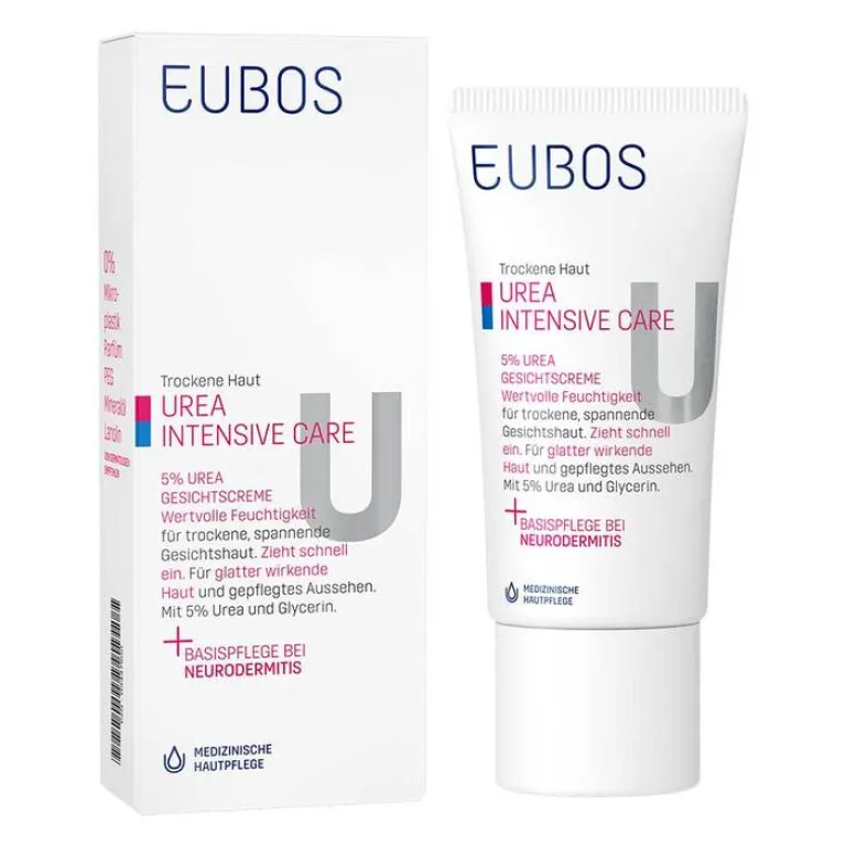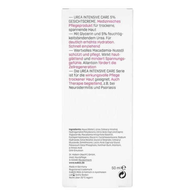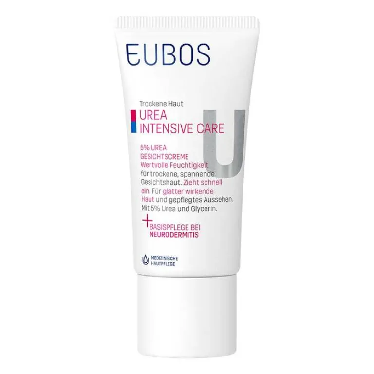 Die Eubos Urea Intensive Care 5% Gesichtscreme ist ein medizinisches Pflegeprodukt für trockene, spannende Haut. Sie ist mit Glycerin und 5% feuchtigkeitsbindendem Urea und sorgt für eine deutlich erhöhte Hydration. Die Gesichtscreme ist schnell einziehend. Wertvolles Macadamia-Nussöl schützt und pflegt. Die Creme ist hautglättend und mindert Spannungsgefühle. Allantoin fördert die Zellregeneration.