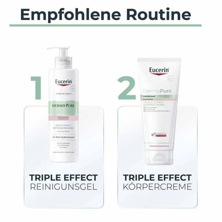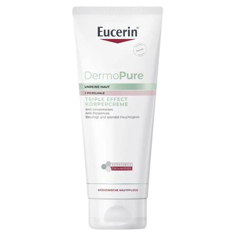 Mit dreifacher Wirkung ist die Eucerin DermoPure Triple Effect Körpercreme nachhaltig effektiv gegen Akne. Mit enthaltener Salicylsäure in der Creme bei Akne werden auch hartnäckige Hautunreinheiten abgeschwächt. Bestehende Pickelmale reduziert die Eucerin Lotion mit Thiamidol®, das zugleich der Neuentstehung von Aknemalen entgegenwirkt. Eine hautberuhigende Creme ist die Körperlotion durch Licochalcone A, mit Glycerin als Hautpflege spendet sie zudem Feuchtigkeit für eine ebenmäßigere Haut.