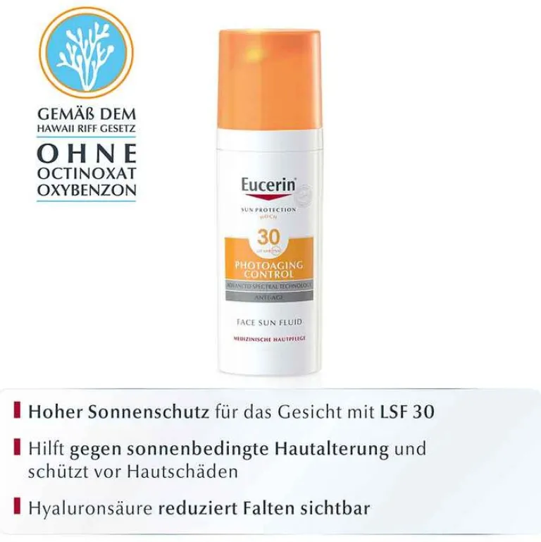 Das Eucerin Photoaging Control Face Sun Fluid LSF 30 ist ein zuverlässiger Sonnenschutz, der alle Hauttypen vor Photoaging schützt. Neben der UV-Strahlung kann auch das hochenergetische sichtbare Licht (HEV-Licht) die Hautzellen beeinträchtigen. Das Sonnenfluid bietet hierfür einen umfassenden Schutz und ist für den täglichen Gebrauch geeignet.