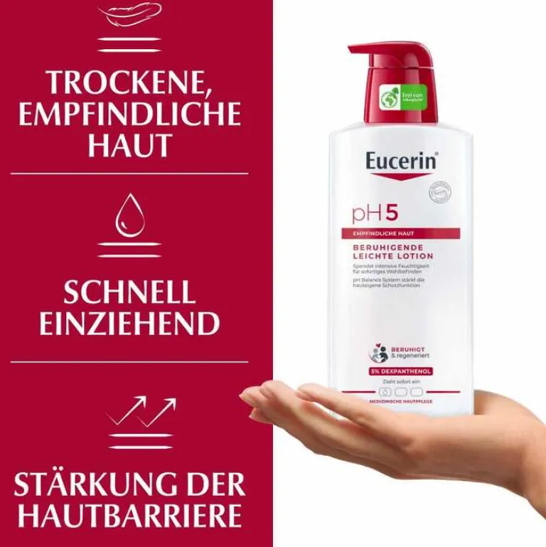 Die Eucerin pH5 Leichte Textur Lotion beruhigt strapazierte Haut und stärkt die hauteigene Schutzfunktion. Die Creme wurde speziell für die Pflege empfindlicher, normaler bis trockener Haut entwickelt, denn besonders empfindliche Haut reagiert schnell mit Spannungsgefühl, Hautrötungen- und irritationen auf Umweltreize. Die Haut benötigt gerade dann eine Lotion, die die natürliche Schutzfunktion stärkt. Die neue Formel der pH5 Lotion zieht dank ihrer leichten Textur schnell ein, ohne zu fetten und hinterlässt die Haut spürbar weicher. Sie verwöhnt mit ihrem dezenten Duft und die Haut wird 24h intensiv mit Feuchtigkeit versorgt.