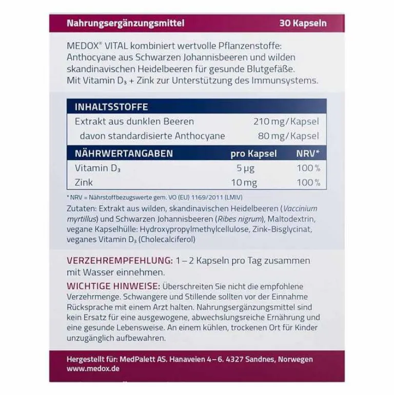 Medox Vital kombiniert als Nahrungsergänzungsmittel wertvolle Anthocyane aus wildwachsenden, skandinavischen Heidelbeeren und schwarzen Johannisbeeren mit Vitamin D3 plus Zink. Mit dieser Kombination unterstützt es die normale Funktion des Immunsystems* – und damit unser Schutzschild gegen Erkältungen und Co.