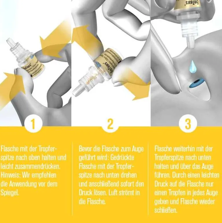 Aufgrund der speziellen Beschaffenheit der EvoTears® Augentropfen ist es möglich, dass Sie den Tropfen im Auge kaum wahrnehmen. In diesem Fall empfiehlt sich das Eintropfen vor dem Spiegel oder das Beobachten der Applikation durch eine zweite Person, bis Sie das Gefühl der Tropfenverteilung auf dem Auge kennengelernt haben.