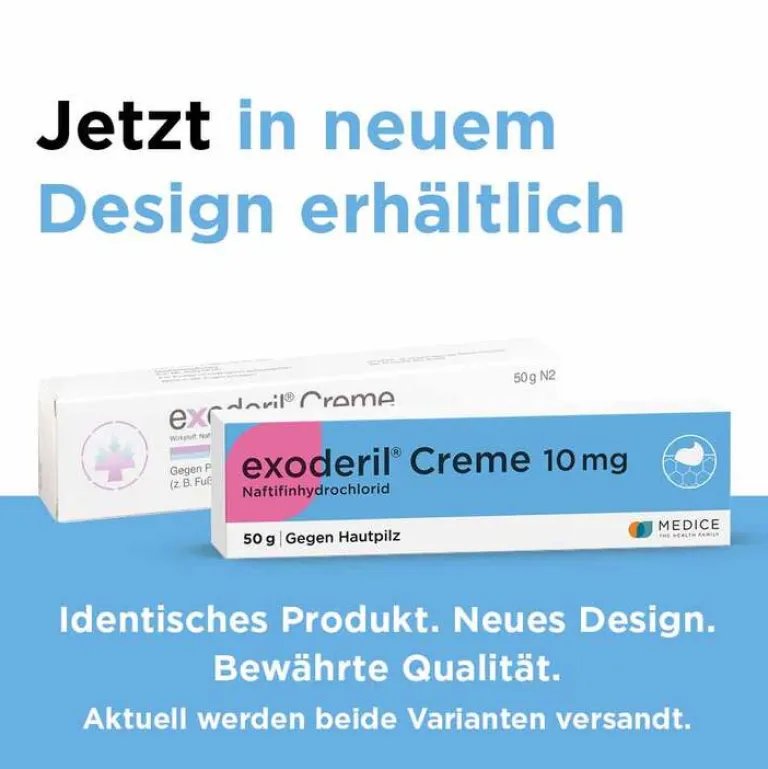 exoderil® Creme 10 mg; Anwendungsgebiete: Pilzinfektionen der Haut (Dermatomykosen), verursacht durch Dermatophyten, Hefe und Schimmelpilze sowie Mischinfektionen mit Bakterien. Warnhinweise: Enthält Stearylalkohol und Cetylalkohol. Nicht in die Augen bringen. Zu Risiken und Nebenwirkungen lesen Sie die Packungsbeilage und fragen Sie Ihre Ärztin, Ihren Arzt oder in Ihrer Apotheke; 02/2018