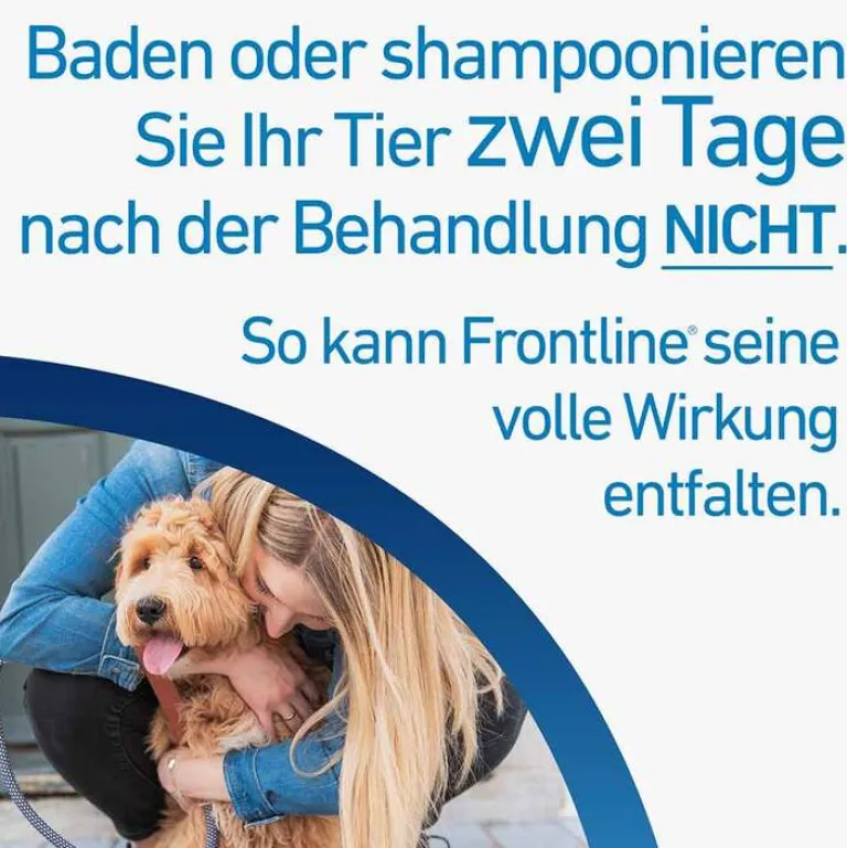 FRONTLINE® SPOT ON verteilt sich nach dem Auftragen mit dem natürlichen Talgfilm der Haut und wirkt so wie ein äußerer, unsichtbarer Schutzmantel gegen Zecken, Flöhe und Haarlinge bei Hunden. Um eine optimale Verteilung gewährleisten zu können, sollten Sie Ihren Hund innerhalb von 2 Tagen nach der Behandlung nicht baden. Bei Kontakt mit der Haut nehmen Parasiten den Wirkstoff auf und werden so innerhalb kurzer Zeit unschädlich gemacht.