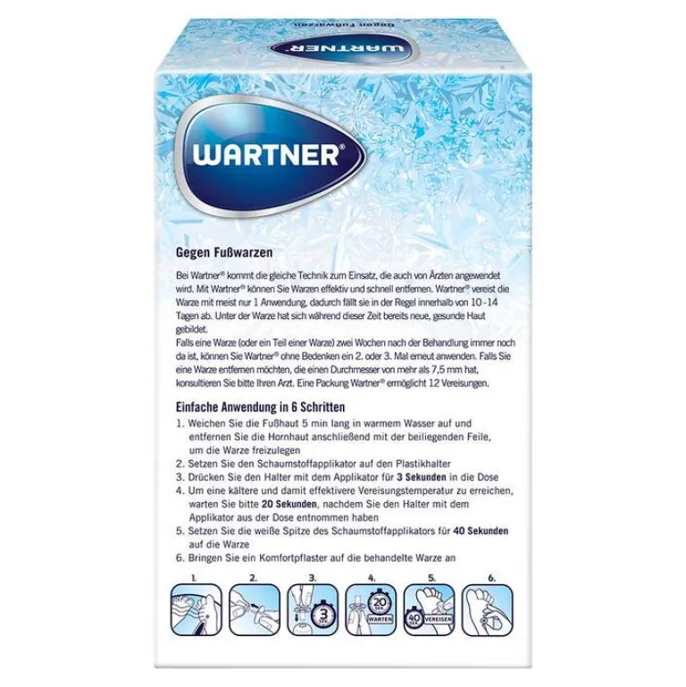 Nach der Behandlung fällt die abgestorbene Warze in der Regel innerhalb von 10 bis 14 Tagen ab. Insgesamt dürfen Sie WARTNER zur Warzen-Vereisung nicht mehr als dreimal an der gleichen Stelle anwenden. Sollte danach keine Verbesserung eingetreten sein, konsultieren Sie einen Arzt.