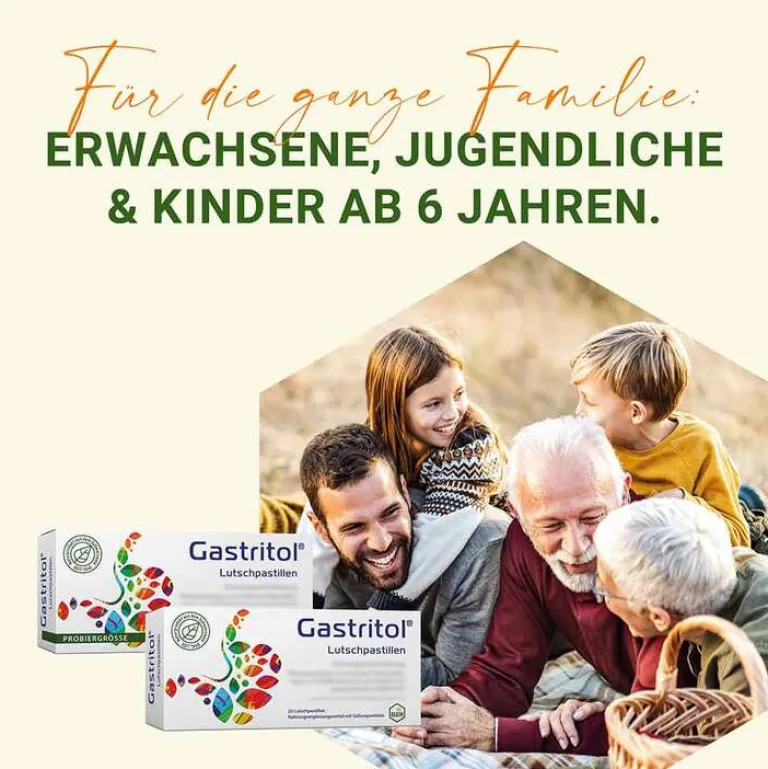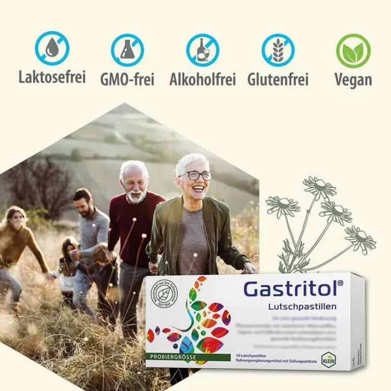 Gastritol Lutschpastillen enthalten natürliche Bitterstoffe. Sie sind ideal für unterwegs und eignen sich für die gesamte Familie, von Erwachsenen über Jugendliche bis hin zu Kindern ab 6 Jahren. Zudem sind sie frei von Alkohol, Laktose und Gluten. Die Lutschpastillen sind vegan, ohne Gentechnologie und Aluminium.