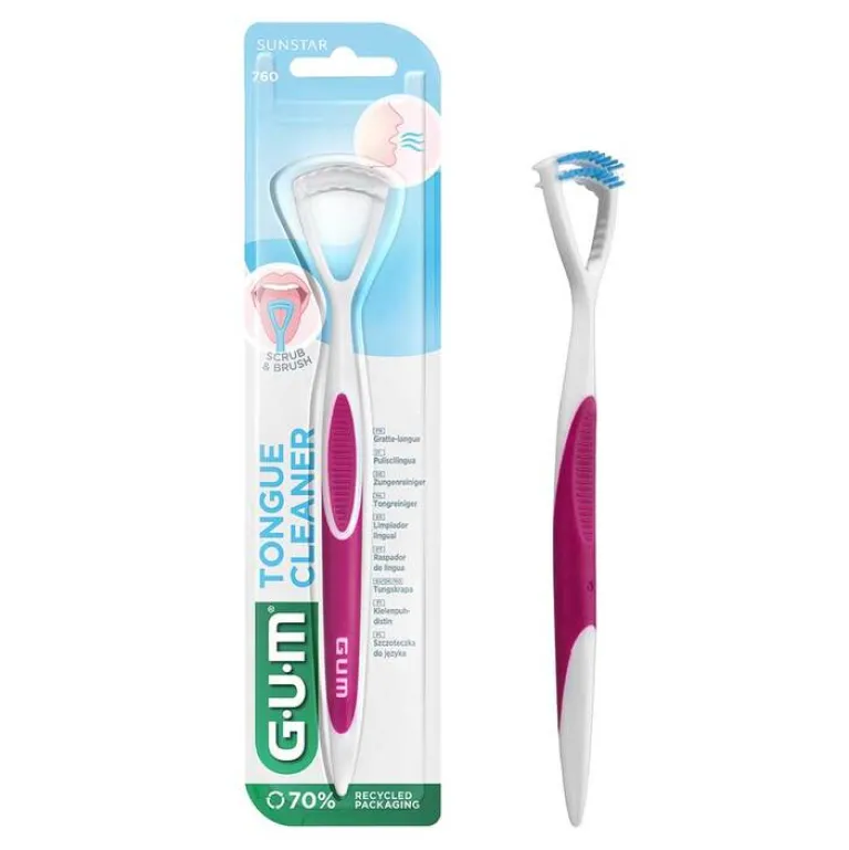 Der GUM HaliControl Zungenreiniger entfernt bakterielle Zungenbeläge und reinigt effektiv die Zunge. Er verfügt über ein Borstenfeld und eine Schabekante. Verwenden Sie den Zungenreiniger zweimal am Tag nach dem Zähneputzen, um Ihre Zunge sauber zu halten und um die Bakterien loszuwerden, die Mundgeruch verursachen können.