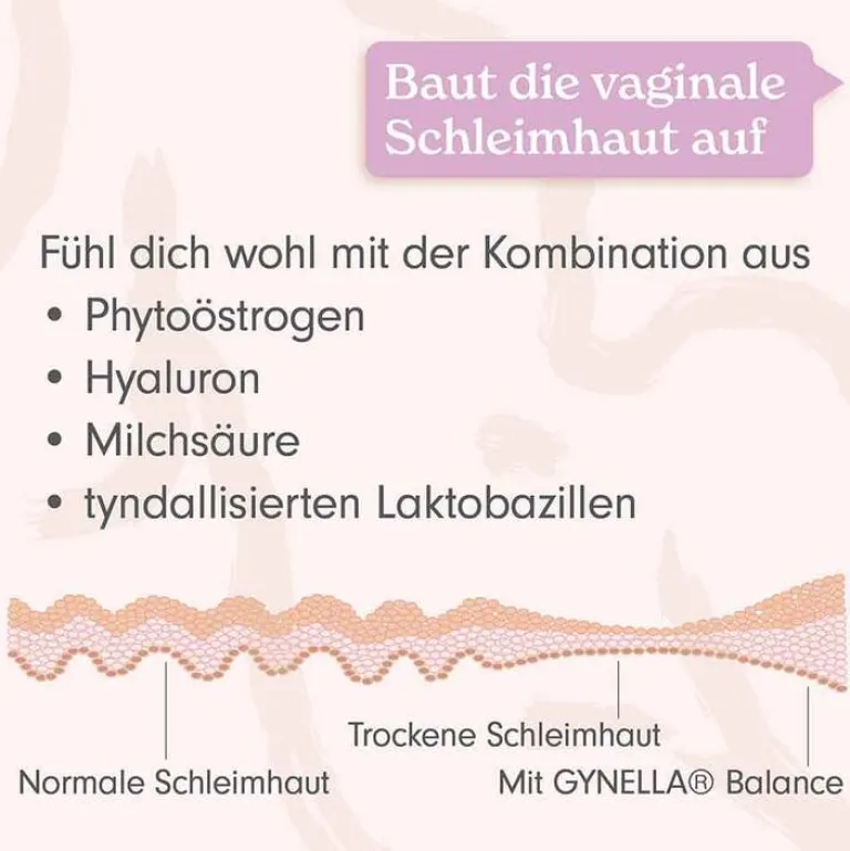 GYNELLA® Balance kann Sie mit seiner innovativen Zusammensetzung dabei unterstützen, das Gleichgewicht und Wohlbefinden in der Vagina wieder herzustellen. Die enthaltenen tyndallisierten, nicht lebensfähigen Milchsäurebakterien können die körpereigene Immunreaktion der Vaginalschleimhaut stimulieren. Hyaluron und Phytoöstrogene helfen die Vaginalschleimhaut ausreichend zu befeuchten und aufrecht zu erhalten. So werden optimale Bedingungen für ein gesundes vaginales Gleichgewicht geschaffen.