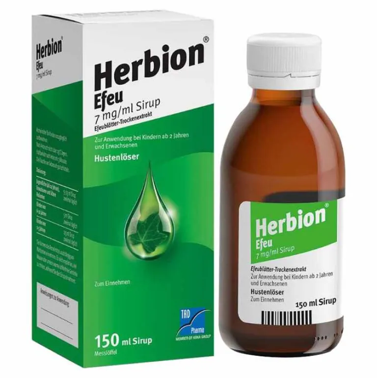 Herbion® Efeu 7 mg/ml Sirup. Wirkstoff: Efeublättertrockenextrakt. Anwendungsgebiete Herbion Efeu ist ein pflanzliches Arzneimittel zur Schleimlösung bei Husten mit Auswurf. Warnhinweise: Enthält Sorbitol, Natriumbenzoat und einen geringen Alkoholanteil (weniger als 100 mg pro Einzelgabe). Packungsbeilage beachten. Wenn Schwierigkeiten beim Atmen, Fieber oder eitriger (Eiter enthaltender) Auswurf auftreten, sollten Sie Ihren Arzt oder Apotheker aufsuchen. Wenn sich die Symptome nach 7 tägiger Einnahme nicht verbessern, müssen Sie auf jeden Fall Ihren Arzt aufsuchen. Stand: September 2020. Zu Risiken und Nebenwirkungen lesen Sie die Packungsbeilage und fragen Sie Ihre Ärztin, Ihren Arzt oder in Ihrer Apotheke.