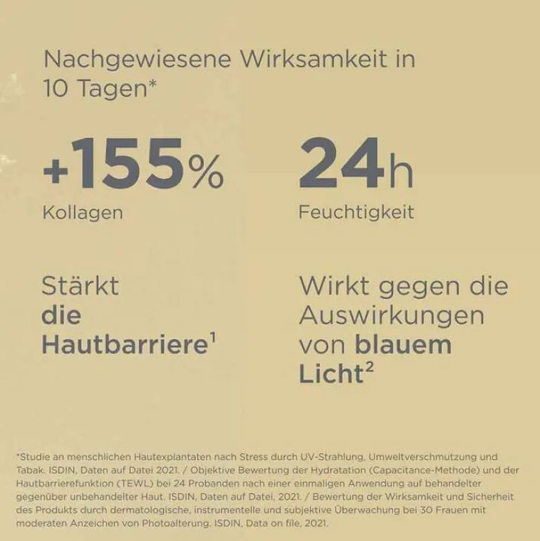¹ Bewertung der Wirksamkeit und Sicherheit von Flavo-C Forte durch dermatologische, instrumentelle und subjektive Überwachung bei 30 Frauen im Alter von 45 bis 70 Jahren mit moderaten Anzeichen von Photoalterung. ISDIN. Data on file, 2021.