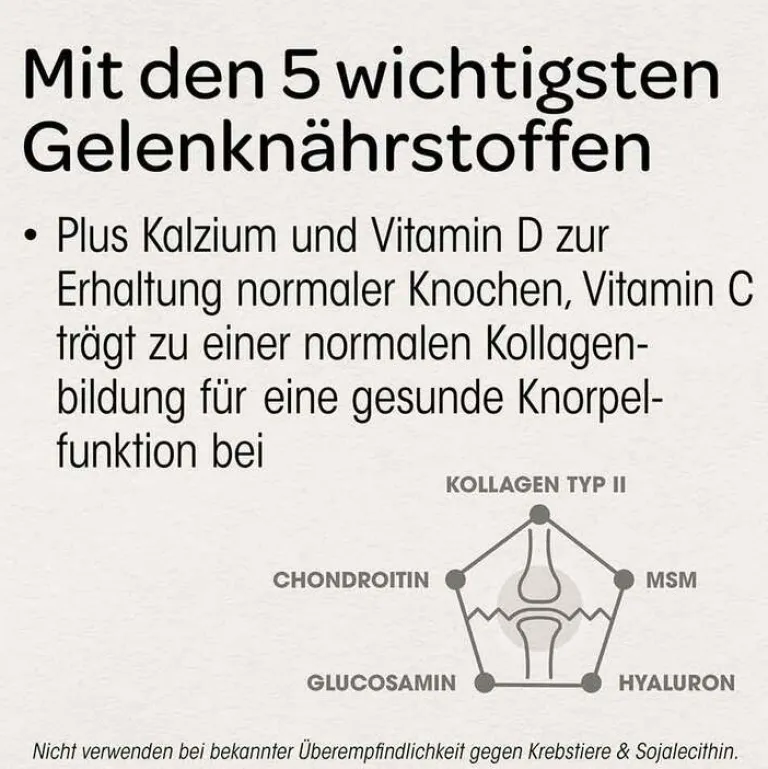 Füllstoff Cellulose, Glucosaminhydrochlorid aus dem Chitin von Krebstieren, Chondroitinsulfat-Natrium, Vitamin C, Kollagenhydrolysat (Ursprung: Huhn), Vitamin E, Natriumselenat, Füllstoff Calciumcarbonat, Methylsulfonylmethan (MSM), Überzugsmittel Hydroxypropylmethylcellulose, Füllstoff Isomalt, Überzugsmittel Schellack, modifizierte Stärke, Trennmittel Siliciumdioxid und Magnesiumsalze der Speisefettsäuren, Füllstoff Calciumphosphate, Mangansulfat, Füllstoff Natrium-Carboxymethylcellulose, Vitamin D3.
