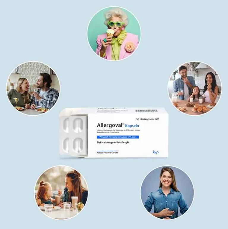 Allergoval® Kapseln.Wirkstoff: Natriumcromoglicat. Anwendungsgebiete: Nahrungsmittelallergie: Fälle von Ekzem, Nesselsucht (Urticaria), Quincke-Ödem, Hautjucken, Störungen des Magen-Darm-Traktes (Erbrechen, Brechreiz, Durchfälle, Bauchschmerz). Asthma und Nasenschleimhautentzündung (Rhinitis), bei denen Nahrungsmittelallergene die hauptsächlichen auslösenden Faktoren darstellen. Zu Risiken und Nebenwirkungen lesen Sie die Packungsbeilage und fragen Sie Ihre Ärztin, Ihren Arzt oder in Ihrer Apotheke. Köhler Pharma GmbH, Neue Bergstraße 3-7, 64665 Alsbach/Bergstraße, www.koehler-pharma.de Stand: 4/2024.