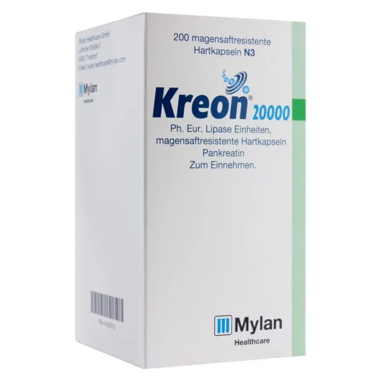 Kreon 20 000 Ph. Eur. Lipase Einheiten Wirkstoff: Pankreas-Pulver vom Schwein. Anwendungsgebiet: Pankreasenzym-Ersatzbehandlung bei exokriner Pankreasinsuffizienz aufgrund von Mukoviszidose oder anderen Zuständen (z. B. chronische Pankreatitis, Pankreatektomie oder Pankreaskrebs). Zu Risiken und Nebenwirkungen lesen Sie die Packungsbeilage und fragen Sie Ihre Ärztin, Ihren Arzt oder in Ihrer Apotheke. Mylan Healthcare GmbH
