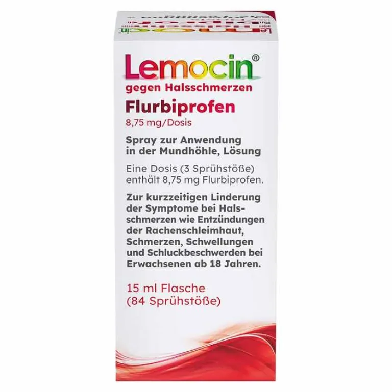 Lemocin® gegen Halsschmerzen Flurbiprofen 8,75 mg/Dosis Spray zur Anwendung in der Mundhöhle, Lösung Zur Anwendung bei Erwachsenen. Wirkstoff: Flurbiprofen. Zur kurzzeitigen Linderung der Symptome bei Halsschmerzen wie Entzündungen der Rachenschleimhaut, Schmerzen, Schwellungen und Schluckbeschwerden bei Erwachsenen ab 18 Jahren. Hinweis: Enthält 0,14 mg Alkohol (Ethanol) pro Dosis (3 Sprühstoße) sowie im Minze- und Kirscharoma: D-Limonen, Citral und Eugenol. Zu Risiken und Nebenwirkungen lesen Sie die Packungsbeilage und fragen Sie Ihre Ärztin, Ihren Arzt oder in Ihrer Apotheke. STADA Consumer Health Deutschland GmbH, Stadastraße 2–18 61118 Bad Vilbel Stand: Januar 2024