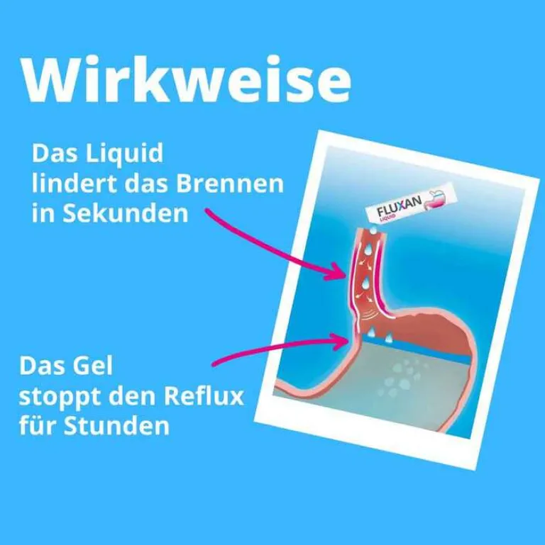 Dank der rein physikalischen Wirkweise entfaltet das Mittel gegen Sodbrennen seine Wirkung innerhalb von Sekunden und bleibt dabei besonders gut verträglich – ohne Einfluss auf den Blutkreislauf. So sorgt Fluxan Liquid für schnelle und langanhaltende Erleichterung bei Sodbrennen und Reflux.