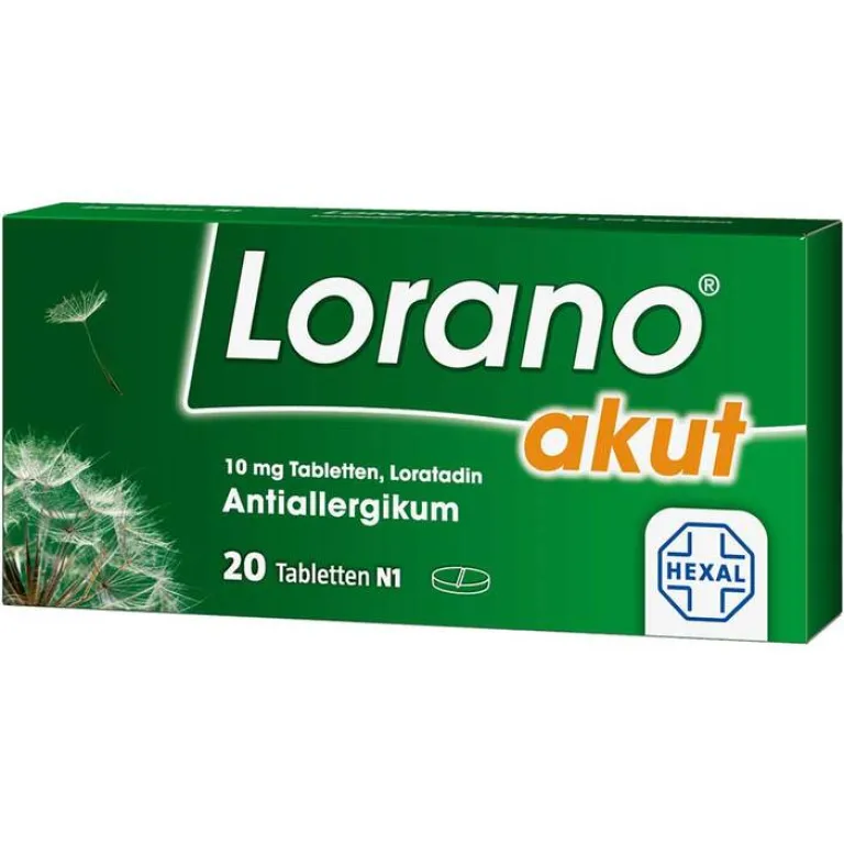 Lorano® akut, 10 mg Tabletten: Lorano® akut, 10 mg Tabletten Wirkstoff: Loratadin. Anwendungsgebiete: Zur Behandlung der Beschwerden bei allergischen Entzündungen im Inneren der Nase, z. B. Heuschnupfen, und bei chronischer Nesselsucht unbekannter Ursache. Warnhinweis: Enthält Lactose. Zu Risiken und Nebenwirkungen lesen Sie die Packungsbeilage und fragen Sie Ihre Ärztin, Ihren Arzt oder in Ihrer Apotheke! Mat.-Nr.: 2/51012340-02 Stand: Mai 2018 Hexal AG, 83607 Holzkirchen, www.hexal.de