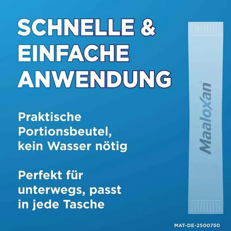 Maaloxan® 25 mVal Liquid. Wirkstoff: Algeldrat, Magnesiumhydroxid. Anw.-geb.: Zur symptomatischen Behandlung von Erkrankungen, bei denen die Magensäure gebunden werden soll: Sodbrennen u. säurebedingte Magenbeschwerden, Magen- od. Zwölffingerdarmgeschwüre (Ulcus ventriculi u. Ulcus duodeni). Hinweise: Nicht bei Kindern unter 12 Jahren anwenden. Beschwerden, die länger als 2 Wochen bestehen, klinisch abklären lassen. Die Einnahme anderer Arzneimittel sollte grundsätzlich mindestens 2 h vor oder nach Einnahme von Maaloxan Liquid erfolgen. Enthält Sorbitol, Pfefferminzöl. Apothekenpflichtig. Zu Risiken und Nebenwirkungen lesen Sie die Packungsbeilage und fragen Sie Ihre Ärztin, Ihren Arzt oder in Ihrer Apotheke. A. Nattermann & Cie. GmbH, Brüningstraße 50, 65929 Frankfurt am Main. Stand: Juli 2022. MAT-DE-2001977