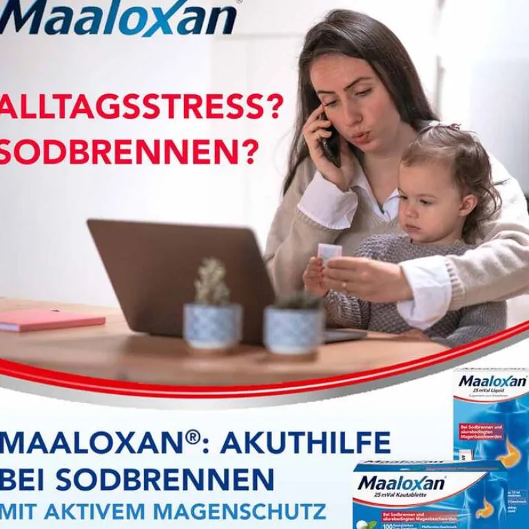 Maaloxan® 25 mVal Suspension. Wirkstoffe: Algeldrat, Magnesiumhydroxid. Anw.-geb.: Zur symptomat. Behandl. von Erkrankungen, bei denen die Magensäure gebunden werden soll: Sodbrennen und säurebedingte Magenbeschwerden, Magen- oder Zwölffingerdarmgeschwüre (Ulcus ventriculi und Ulcus duodeni). Hinweise: Nicht bei Kindern unter 12 Jahren anwenden. Beschwerden, die länger als 2 Wochen bestehen, klinisch abklären lassen. Enthält Sorbitol, Pfefferminzöl, Methyl-4-hydroxybenzoat und Propyl-4-hydroxybenzoat (Parabene). Die Einnahme anderer Arzneimittel sollte grundsätzlich mindestens 2 h vor oder nach Einnahme von Maaloxan Suspension erfolgen. Apothekenpflichtig. Zu Risiken und Nebenwirkungen lesen Sie die Packungsbeilage und fragen Sie Ihre Ärztin, Ihren Arzt oder in Ihrer Apotheke. A. Nattermann & Cie. GmbH, Brüningstraße 50, 65929 Frankfurt am Main. Stand: Juli 2022. MAT-DE-2001977