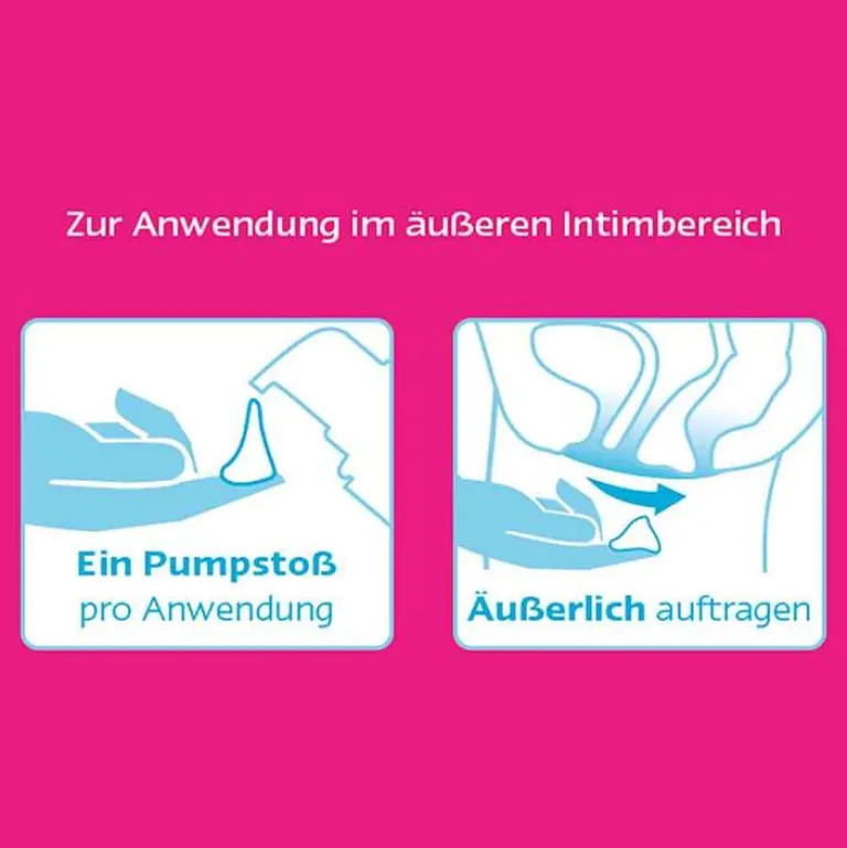 Vor dem Auftragen sollten die Hände gründlich gewaschen werden. Einen Pumpstoß des Gels auf den Zeigefinger geben und im gesamten äußeren Intimbereich (Vulva, Damm und Analbereich) verteilen.