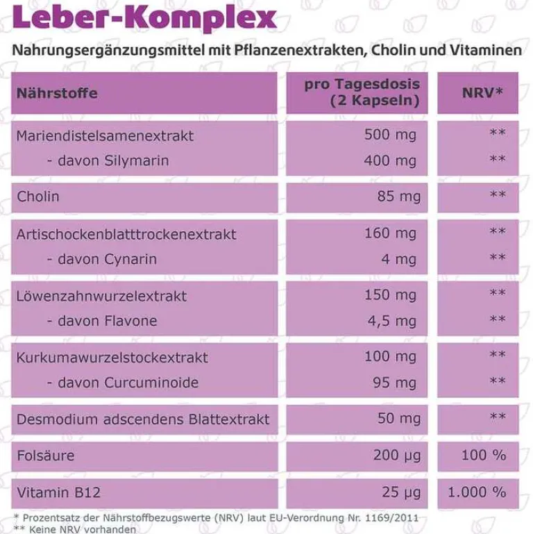Das Produkt enthält hochwertige Extrakte aus Mariendistel, Artischocke, Kurkuma, Löwenzahn und Desmodium adscendens, auch Bettlerkraut genannt. Zusätzlich enthalten die Leber-Kapseln die essenziellen Mikronährstoffe Vitamin B12 und Folsäure. Unser Leber-Komplex enthält wertvolle Bitterstoffe, ist vegan, laktosefrei und glutenfrei. Die Kapseln sind frei von künstlichen Aromen und enthalten keinen zugesetzten Zucker. Unsere 120 Kapseln bieten eine effektive Versorgung für 2 Monate.