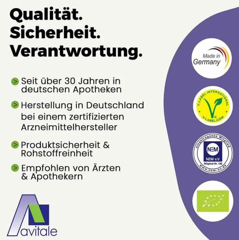 Die tägliche Verzehrempfehlung darf nicht überschritten werden. Nahrungsergänzungsmittel sind kein Ersatz für eine ausgewogene und abwechslungsreiche Ernährung und gesunde Lebensweise.