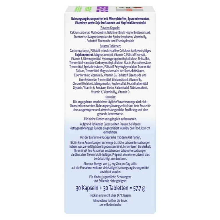 Zutaten Kapseln: Calciumcarbonat, Maltodextrin, Gelatine (Rind), Hopfenblütenextrakt, Trennmittel Magnesiumsalze der Speisefettsäuren, Vitamin B6, Farbstoff Eisenoxide und Eisenhydroxide.Zutaten Tabletten: Calciumcarbonat, Füllstoff mikrokristalline Cellulose, isoflavonhaltiges SOJAKONZENTRAT, Magnesiumoxid, Vitamin C, Füllstoff Isomalt, Vitamin E, Überzugsmittel Hydroxypropylmethylcellulose, Zinksulfat, Trennmittel vernetzte Carboxymethylcellulose, Niacin, Pantothensäure, Trennmittel Speisefettsäuren, Füllstoff Polyvinylpyrrolidon, Trennmittel Talkum, Trennmittel Magnesiumsalze der Speisefettsäuren, Eisenfumarat, Vitamin B1, Vitamin B2, Farbstoff Eisenoxide und Eisenhydroxide, Trennmittel Siliciumdioxid, Vitamin B6, Chrom(III)-chlorid, Mangansulfat, Kupfersulfat, Feuchthaltemittel Glycerin, Vitamin A, Folsäure, Biotin, Kaliumiodid, Natriumselenit, Vitamin K, Vitamin B12, Vitamin D.