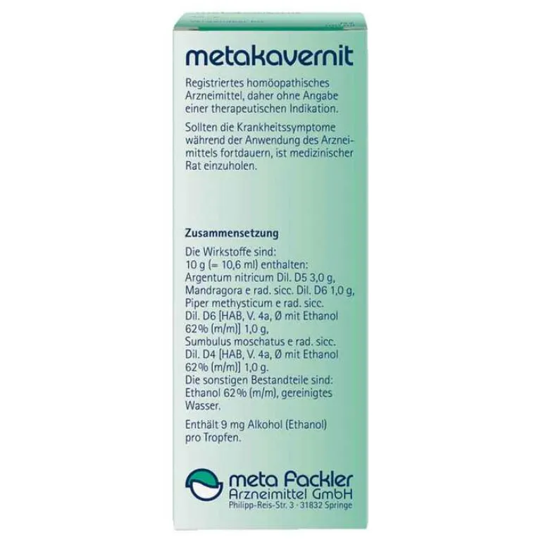 metakavernit Mischung. Anwendungsgebiete: Registriertes homöopathisches Arzneimittel, daher ohne Angabe einer therapeutischen Indikation. Enthält 9 mg Alkohol (Ethanol) pro Tropfen. Zu Risiken und Nebenwirkungen lesen Sie die Packungsbeilage und fragen Sie Ihre Ärztin, Ihren Arzt oder in Ihrer Apotheke. meta Fackler Arzneimittel GmbH, D-31832 Springe.