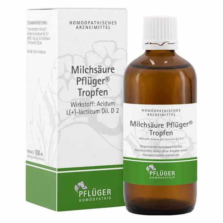Milchsäure Pflüger® Tropfen Registriertes homöopathisches Arzneimittel, daher ohne Angabe einer therapeutischen Indikation. Enthält 18 Vol.-% Alkohol. Zu Risiken und Nebenwirkungen lesen Sie die Packungsbeilage und fragen Sie Ihre Ärztin, Ihren Arzt oder in Ihrer Apotheke.