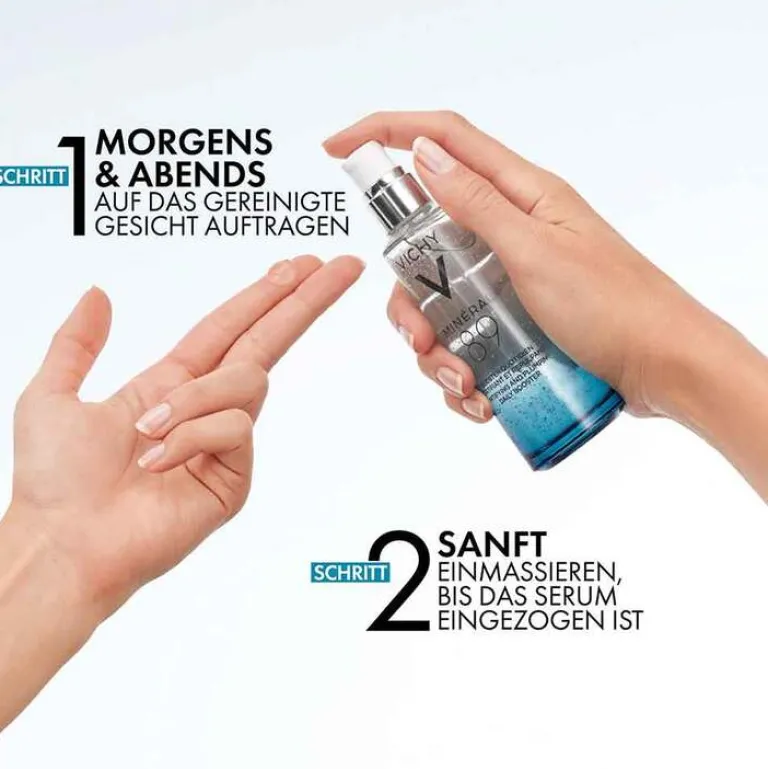 Den Vichy Mineral 89 Hyaluron-Boost täglich morgens und abends als ersten Schritt der Pflegeroutine auf das gereinigte Gesicht, auf Hals und Dekollete auftragen. Dafür zwei Pumpstöße mit den Fingerspitzen sanft einmassieren. Da die sanfte Formel der Gesichtspflege auf Alkohol & Duftstoffe verzichtet, ist sie auch für die Anwendung auf empfindlicher Haut geeignet.