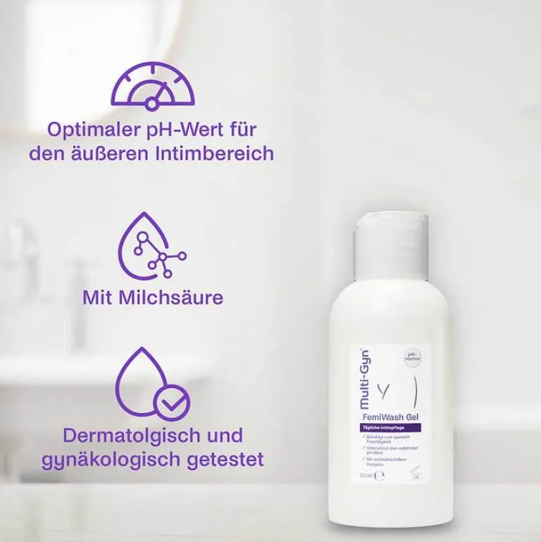Das Multi-Gyn FemiWash Gel ist ein Intim-Waschgel, das sich ideal für den täglichen Gebrauch eignet. Der natürliche 2QR-Komplex und Panthenol beruhigen und pflegen empfindliche Haut. Dank Milchsäure fördert es einen optimalen pH-Wert und schützt die natürliche Flora im äußeren Intimbereich. Mit einem hautfreundlichen und antibakteriellen Komplex. Es ist nicht austrocknend, für empfindliche Haut geeignet und kann auch für die Intimrasur verwendet werden. Multi-Gyn FemiWash Gel passt gut zu anderen Multi-Gyn Produkten und ist dermatologisch sowie gynäkologisch getestet.