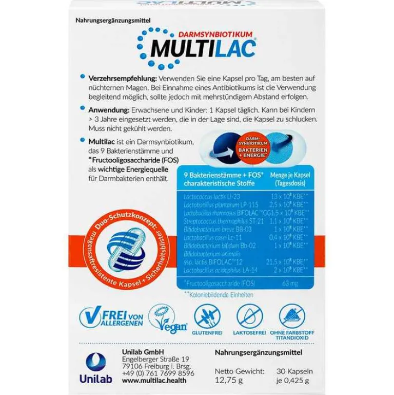 Multilac enthält 4,5 Milliarden Bakterien (9 unterschiedliche Milchsäurebakterienstämme) und Fructooligosacchariden (FOS).