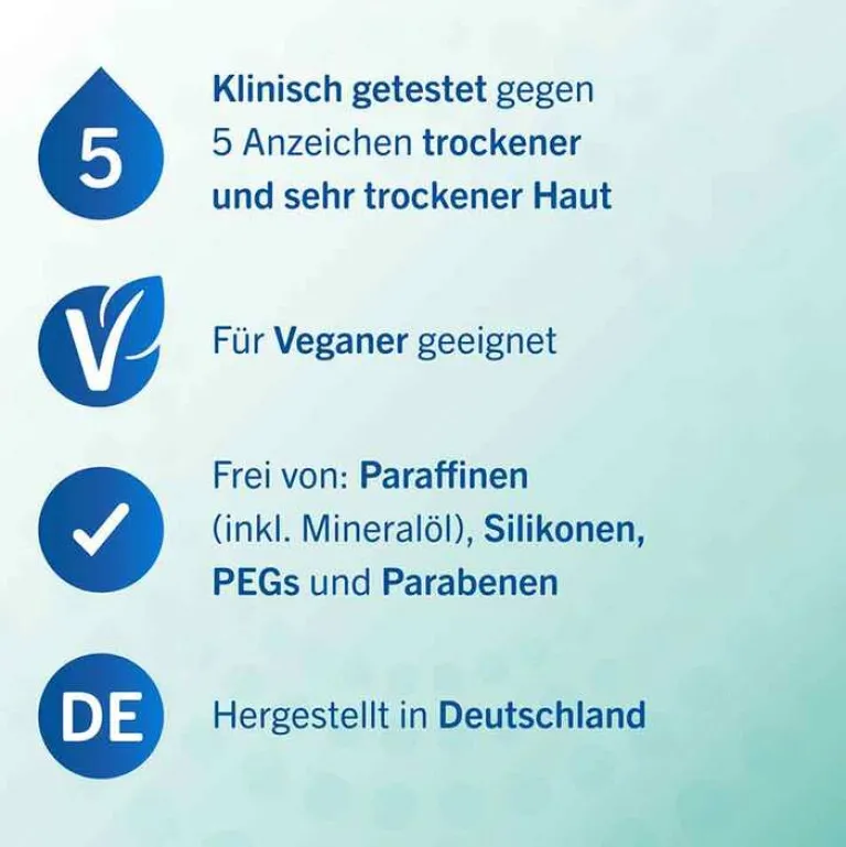 - klinisch gestestet gegen die 5 Anzeichen trockener Haut: Trockenheit, Feuchtigkeitsverlust, Spannungsgefühl, Spröde Haut, Hautirritationen