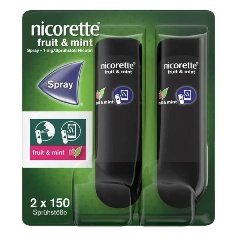 Nicorette® Fruit & Mint Spray, 1 mg/Sprühstoß. Wirkstoff: Nicotin. Anwendungsgebiete: Behandlung der Tabakabhängigkeit bei Erwachsenen durch Linderung der Nicotinentzugssymptome, einschließlich des Rauchverlangens, beim Versuch das Rauchen sofort aufzugeben oder zur Verringerung des Zigarettenkonsums (Rauchreduktion), um auf diesem Weg den vollständigen Rauchausstieg zu erreichen. Die komplette Einstellung des Rauchens sollte das endgültige Ziel sein. Warnhinweise: Enthält Ethanol, Propylenglycol und Butylhydroxytoluol. Zu Risiken und Nebenwirkungen lesen Sie die Packungsbeilage und fragen Sie Ihre Ärztin, Ihren Arzt oder in Ihrer Apotheke. Kenvue Germany GmbH, 41470 Neuss. Stand: 05/2025