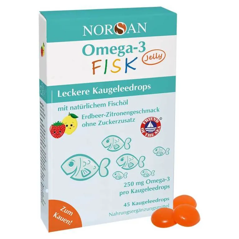 Norsan Omega-3 Fisk Jelly Dragees für Kinder sind fruchtig leckere Kaugeleedrops und besonders für Kinder, Teenager und Erwachsene geeignet. Mit natürlichem Fischöl aus Wildfang sind sie reich an EPA und DHA. Das enthaltene Fischöl ist aus nachhaltigem Wildfang und wird schonend gereinigt von Schadstoffen und Schwermetallen. Die Dragees werden in Norwegen produziert.