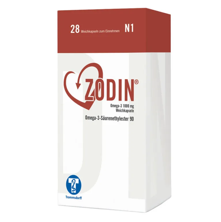 Zodin® Omega-3 1000 mg Weichkapseln. Wirkstoff: Omega-3-Säurenethylester 90. Zusammensetzung: 1 Weichkapsel enthält 1000 mg Omega-3-Säurenethylester 90, mit einem Gehalt von 460 mg Icosapent-Ethyl und 380 mg Doconexent-Ethyl einschl. 4 mg d-a-Tocopherol (vermischt mit einem pflanzlichen Öl wie z. B. Sojaöl) als Antioxidans. Sonstige Bestandteile: Gelatine, Glycerol, mittelkettige Triglyceride, Lecithin (Soja), gereinigtes Wasser. Anwendungsgebiet: Zur Behandlung bestimmter Formen von erhöhten Blutfettwerten (endogene Hypertriglyceridämie), wenn geeignete diätetische Maßnahmen allein nicht ausreichen. Gegenanzeigen: Überempfindlichkeit gegen den Wirkstoff, Soja, Erdnuss oder gegen einen der sonstigen Bestandteile. Nebenwirkungen: Häufig: Vorhofflimmern, gastrointestinale Störungen. Gelegentlich: Hyperglykämie, Gicht, Schwindel, Störung des Geschmacksempfindens, Kopfschmerzen, Hypotonie, Epistaxis, untere Gastrointestinalblutung, Hautausschlag. Selten: Hypersensitivität, Lebererkrankungen, Urtikaria. Nicht bekannt: Pruritus. Warnhinweise: Nicht über 25 °C lagern. Nicht einfrieren. Apothekenpflichtig. Stand: August 2024. In Lizenz der Firma BASF AS, Norwegen. Trommsdorff GmbH & Co. KG, 52475 Alsdorf.